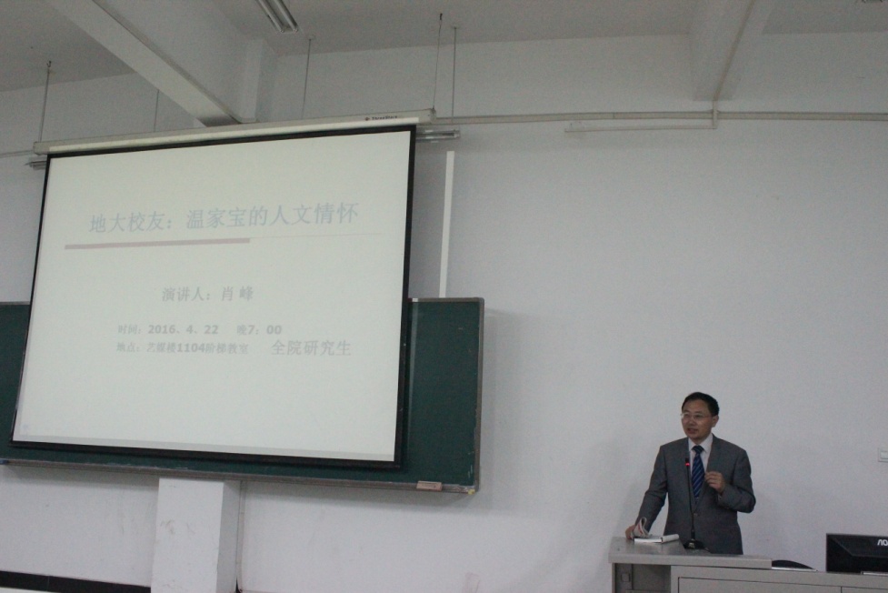 (通讯员许红梅 李铭洋 摄影刘鸣)4月22号晚7点,2016年艺术与传媒系列讲座第三讲在艺媒楼1104 教室如期举行。公司新闻传播系肖峰教授,为同学们详细讲述了地大校友温家宝的人文情怀。