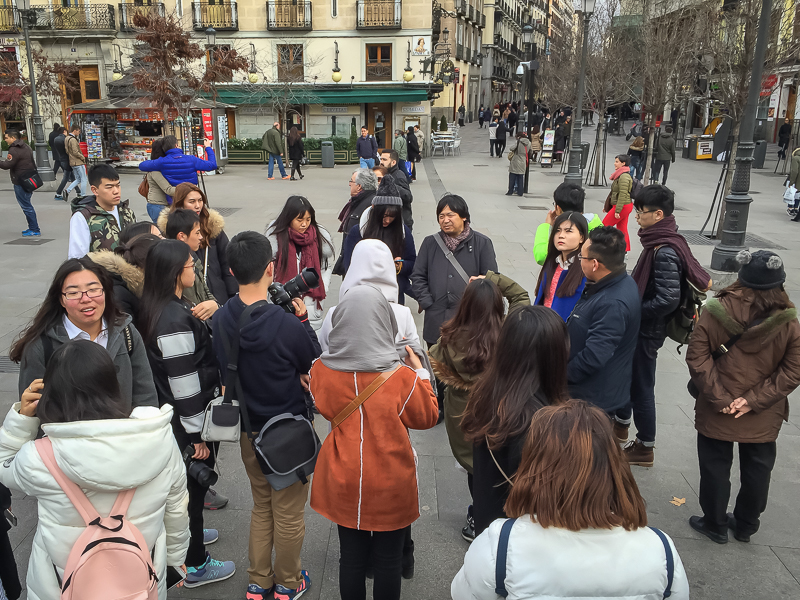 参观完毕,访学团一行从卡洛斯三世大街穿过,经伊莎贝拉二世广场,步行至太阳门广场,领略马德里古城风貌。太阳门广场,通常简称Sol,是马德里的市中心,从广场上有很多条道路向外延伸。广场上有一个“零起点”标志,西班牙全国所有的公路里程碑都从这开始向外计算,马德里市的门牌号也以这里为起点。站在广场的中心,马林老师向访学团介绍了位于太阳门广场一侧的马德里市政厅,并示意访学团细看市政厅的墙壁。只见市政厅大门两侧的墙上张贴着中文“春”字,并印有新春快乐几字,足可见西中友谊之深厚,访学团成员均为此而感到欣喜,并纷纷拿出相机,记录下这温馨的时刻。