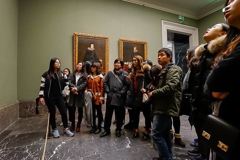 参观完毕,访学团跟随马林老师前往普拉多美术馆,瞻仰西班牙三杰:委拉斯开兹、戈雅及格雷科的名作。普拉多美术馆主要分为两层,并含有多个展馆。首先,马林老师带领访学团前往观赏委拉斯开兹的作品。他认为,委拉斯开兹的画作具有十足的吸引力。即使他的画作没有太多的细节,但也能靠着极其敏锐的色彩感觉,将事物的结构、光线等都表达清楚,使画面显示真实而自然。同时,他也是西班牙在罗马建立的艺术研究院中最优秀的学生,后来被选为王室的御用画家。