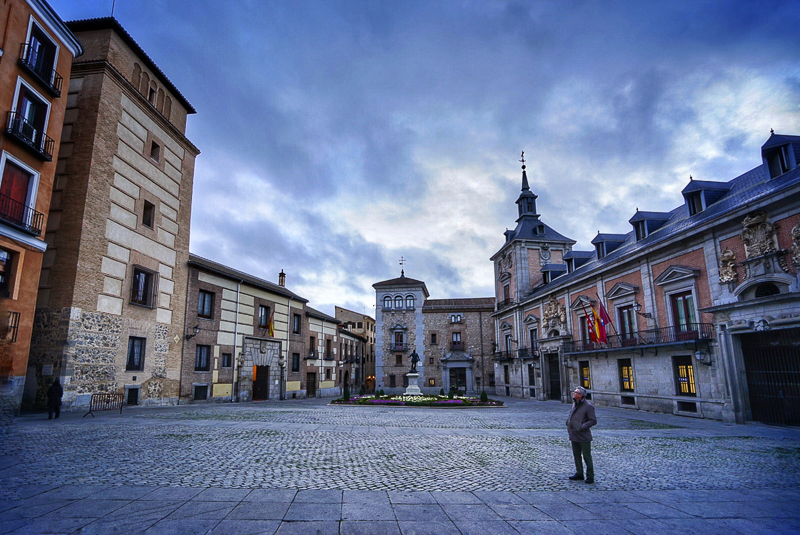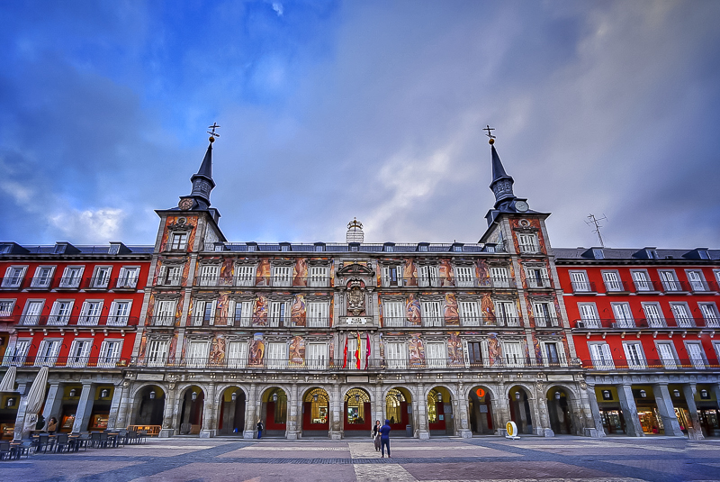 下午5点45分,访学团沿小巷行走,步行到达马约尔广场。这个有着独特风格的四方形广场是由多幢四层高的建筑所联围而成,初建至今已有四百多年。广场在建成之后的漫长岁月里曾经历了三次火灾,又重新修建,直至1953年完成后才形成如今的样子。马林老师表示:“在广场中央是菲里普三世的青铜骑马雕像,但整个广场的亮点却是某幢建筑之上所绘制的彩绘,彩绘十分精细,颇具西班牙风格。”访学团成员均对此表示赞同,并提议在建筑彩绘前合影纪念。