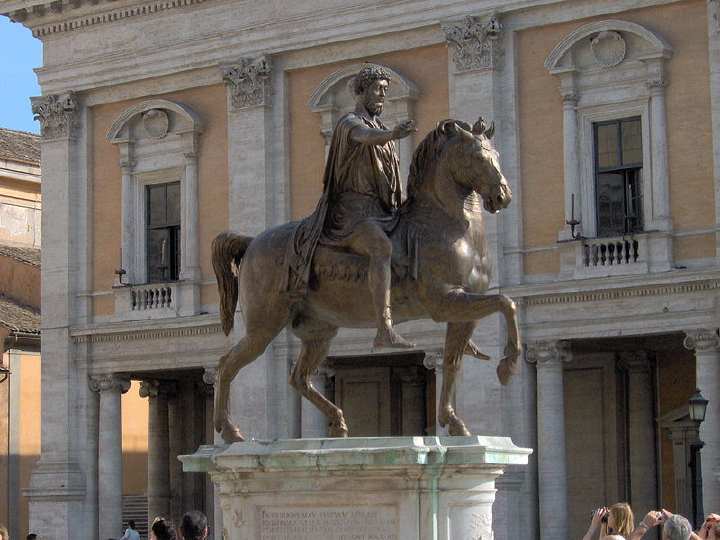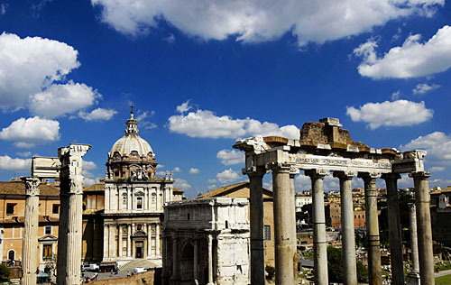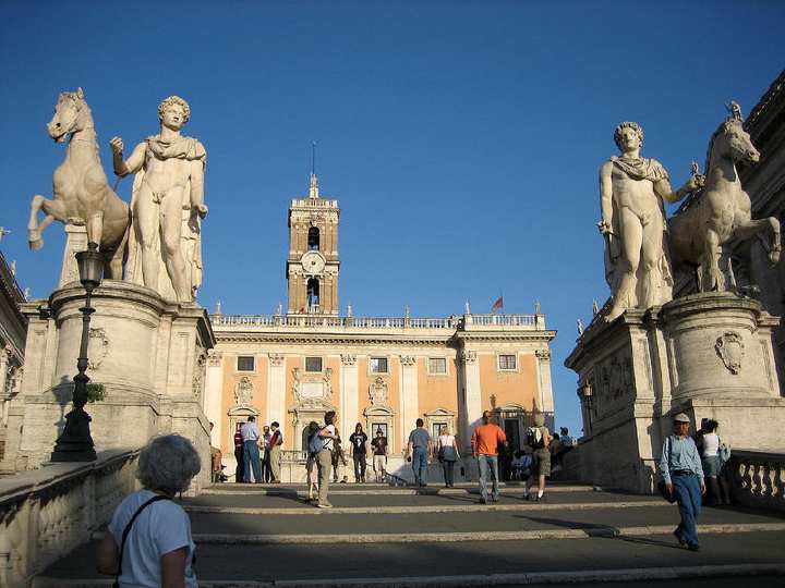 卡比托利欧广场是由艺术大师米开朗琪罗亲自设计的,大气而端庄,建于中世纪是罗马元老院开会的地方,它的正面是罗马市政府,它的建成代表着罗马城新的政治中心,它右边的母狼和一对孪生兄弟象征着罗马城。邻边的古罗马广场遗址上屹立着提图斯凯旋门、奥古斯都凯旋门等古罗马建筑还有昔日古罗马帝国时期奴隶交易的残垣断壁和远方的罗马斗兽场都依稀可见。