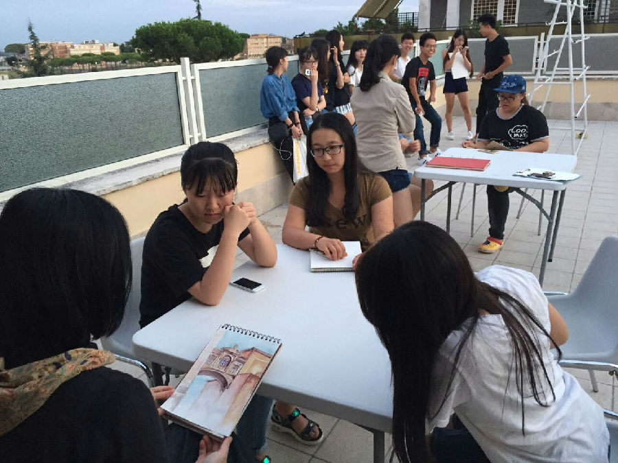 上午各个小组在不同的观景点写生感受着古罗马遗址依存的帝国气息,下午完成此行任务后黄瑛老师认真审视指导学生们的作品,晚上同学们还一直讨论着几天后要准备的展览作品的事情。