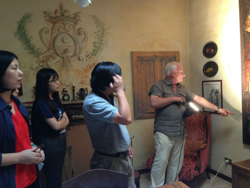 写生小组首先来到博尔拉特位于镇中心的寓所参观,这是一栋中世纪公爵的旧居,其祖父于上个世纪购买下来,博尔拉特对房屋中残留的壁画进行了重新绘制和修复,使其面貌焕然一新。同学们由衷的赞叹博尔拉特技术的高超,与房屋中壁画与陈设品独特的艺术性。博尔拉特为写生小组的到来,特地早起准备了丰盛的意大利午餐。小组成员在浓郁的艺术氛围中,享受地道的意式通心粉、火腿等美味佳肴。
