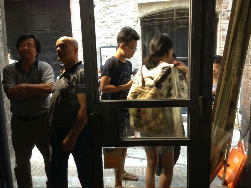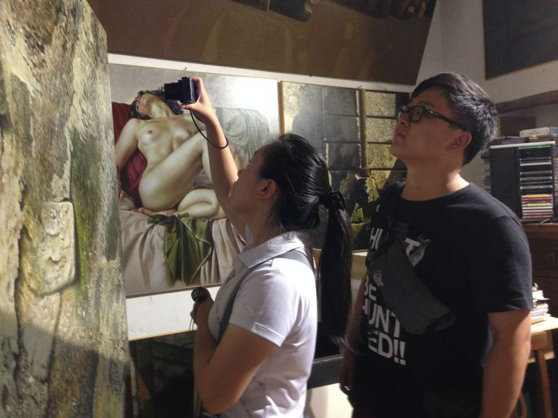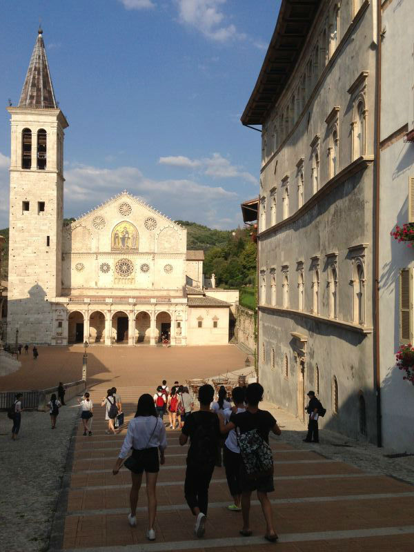 当地时间8月31日的活动,安排在斯波莱托古镇内。下午参观了本地具象写实主义艺术家山德罗巴斯蒂尼的工作室。对于他高超的写实技艺,大家惊叹不已,巴斯蒂尼给每位来访的同学赠送了他的作品精选集。之后,马林老师带大家参观了镇上的多摩教堂。有着悠久历史的教堂,大厅内的天顶壁画,出自文艺复兴时期,著名画家波提切利的老师菲利普力皮之笔下。他的作品透视精准,内容一直与宗教相关联,体现着虔诚的基督教徒对上帝的至上之爱。同时,在画面中透露着音乐的旋律,富有优雅的诗意。