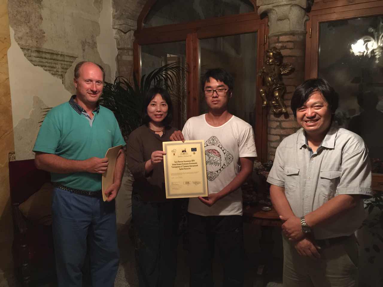欧盟文化参赞菲利普先生,给每位参展的同学颁发了参展证书。负责带队的黄瑛老师和马林老师,一致认为从这次展出的作品中,依稀可以窥见参观威尼斯双年展,以及到各大博物馆学习所受到的影响。有些作品较为完整,而有些还不是很成熟,但是无论如何,都是在往前迈进。