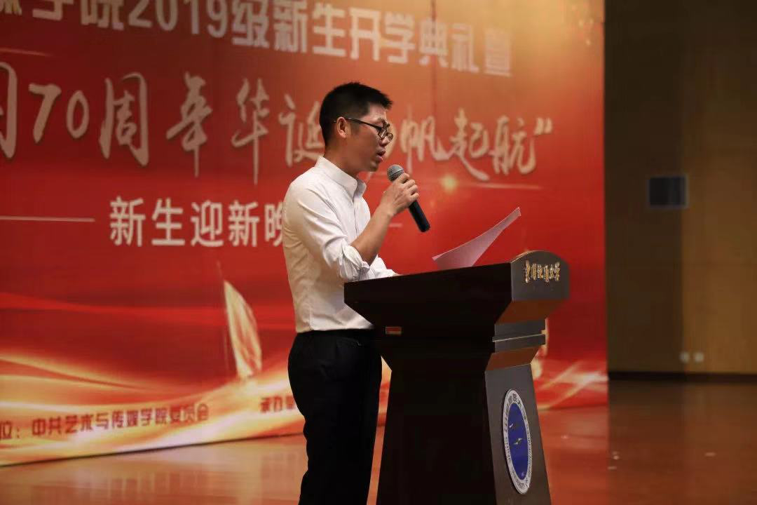 院长桂宇晖教授致辞,桂院长向大家简要阐述了学院三大学科的特点,介绍了公司音乐学,设计学,新闻传播学近几年取得的成就。桂院长谈到,每年开学典礼上的讲话都是他十分重要的时刻,他和全体老师一样,希望艺媒学子在未来都能成为伟大的音乐家、设计师、新闻传播者和科普传播专家。讲话几度被场下热烈的掌声打断。最后,桂院长引用了中国美术学院校长许江的一句话:“我们对学生既不是管,也不是不管,而是两个字——守望”,期待大家能够不断成长,把自己的青春融合在每个学习的日常。