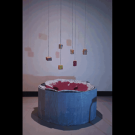 《沉没》: 作品的装置的粉末与流沙掉落并被细砂吞没,一起下沉,最终消失于漆黑的小洞里。历史终究不抵时间的漩涡