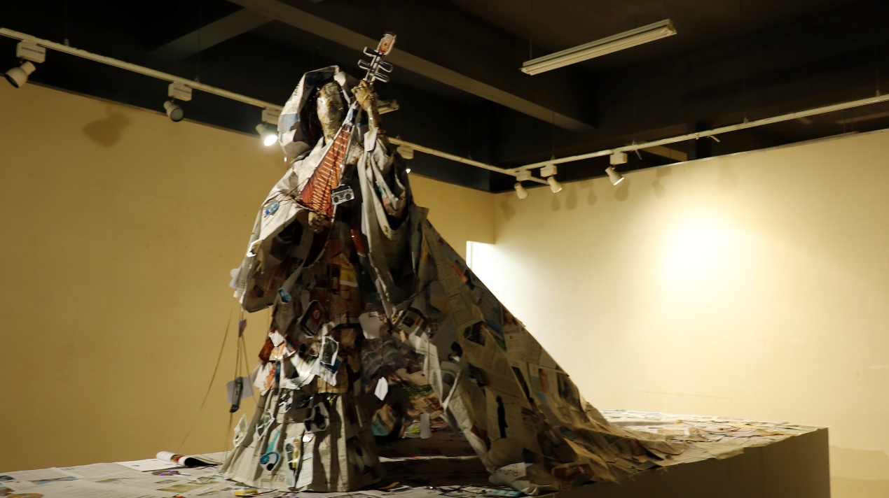《印象》:作品以汉代四大美人之一的王昭君为灵感来源,对印象进行了解构。而作品所用到的材料是报纸、杂志、磁帯光碟等皆是传播媒介的代表,重现被媒介记载和传播方式所塑造的肢体想象