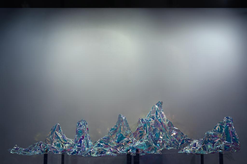《无形山》: 材质为透明的镭射纸,在光线下反射出绚烂的影像,致敬那未被文字记载却孕育了荆楚文明的上古时代。