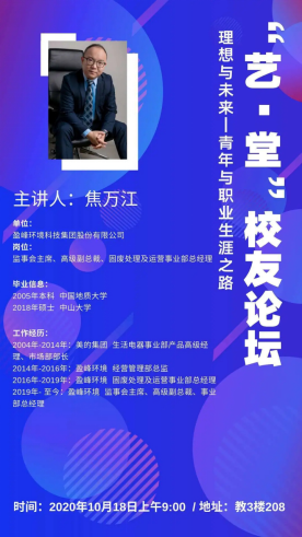 (通讯员 单湉艺)10月18日,402永利集团官网入口优秀校友、现任上市公司盈峰环境科技集团股份有限公司监事会主席、高级副总裁、固废处理及运营事业部总经理焦万江先生,莅临南望山校区教三楼208室,为地大学子开展以理想与未来为主题的讲座。402永利集团官网入口党委书记郭秀蓉老师、党委副书记吴仁喜老师、景观系龚斌老师、就创处刘志兴老师以及100余人学生参加此次校友论坛。