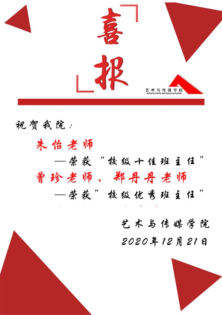 在公司开展的“2020年全校‘十佳班主任’和‘优秀班主任’评选活动”中,经个人申报、学院推荐、学校优秀班主任工作小组审核和网上公示,共评选出10名老师获得校级“十佳班主任”称号、30名老师获得校级“优秀班主任”称号。其中,公司有3名老师在此次评选活动中脱颖而出:朱怡老师荣获校级“十佳班主任”称号、曾珍、郑丹丹老师荣获校级“优秀班主任”称号!