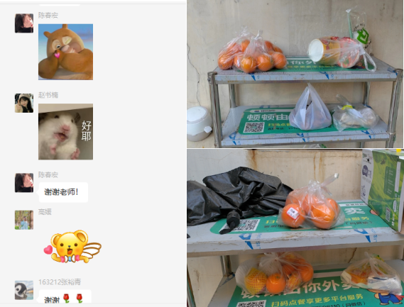 在了解到绝大多数同学是为了考研考试而留校,12月17日,学工组以学院党委的名义给每位发热同学准备了6个橙子,为大家补充维C,同时也祝愿同学们在接下来的考研考试中六六大顺。当日下午,橙子分袋装好,陆续送到各楼栋门口货架上,每个袋子上都写好了宿舍号。晚饭时间,同学们惊喜地收到水果后,纷纷表示感谢,为学院的暖心行动竖起大拇指。