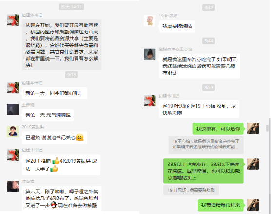 了解到还有36名本科生和25名研究生存在相关症状后,边书记第一时间关心同学们的吃饭、用药及高烧期间的安全问题。后续果然有学生突发高烧需要药品,联系群迅速起到了作用,退烧药和酒精贴及时送到了学生手上,同时,也有更多同学在群里发布自己恢复的喜讯,提供多余药物,更新药店信息,介绍发烧经历,安抚躁动情绪。
