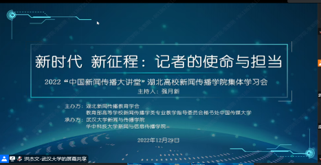 (通讯员于梦涵 王琦)2022年12月29日下午是支部主题日活动时间,为创新支部学习形式,进一步深入贯彻学习党的二十大精神,下午14:30,新闻传播系支部组织动员师生参加以“新时代 新征程:记者的使命与担当”为主题的2022年中国新闻传播大讲堂——湖北分会场在线学习会,来自省内23所高校、2000余名师生参加,公司新闻传播系全体教师、研究生和本科大一的同学们参加了此次学习。