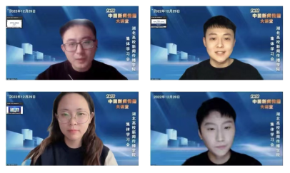 会议由教育部高等学校新闻传播学类教职委主任、中国传媒大学高晓虹教授和武汉大学新闻传播学院院长强月新教授一同统衔主持,由参加了大讲堂制作、来自中国传媒大学的翁旭东、曲伸、卢肖依、李超鹏四位同学担当主讲人,选取2022年中国新闻传播大讲堂的32讲系列课程视频中的参与制作视频等分别分享了作为一名出色的新闻工作者,应当如何保持头脑灵活以进行话语创新、在喧嚣的舆论场如何叫响“三农”声音、当代新闻工作者如何做一名合格的新闻舆论工作者以及从脚力、眼力、脑力、笔力四个方面出发,陈述了新时代一名优秀记者应保持的态度和高度。四位同学的讲解思路清晰、内容生动有趣、思考透彻深刻。