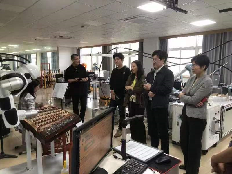 随后庹祖海主任一行参观了公司音乐科技团队自主研发的海百合音乐机器人,海百合和音乐系学生交互演奏《茉莉花》进行了欢迎。音乐科技团队负责人周莉副教授对海百合的智能识谱、智能作曲等功能进行了介绍,庹祖海对我院艺术与科技学科交叉取得的成果表示认可,期待艺科所和地大进一步深化合作,希望相关科研成果能为演艺行业转型升级提供支持,推动相关成果的转化和推广应用。