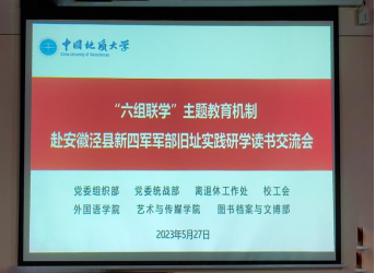 遵循学校主题教育“学思想、强党性、重实践、建新功”的目标要求,学校党委组织部、党委统战部、工会、离退休工作处、图书档案与文博部、外国语学院、402永利集团官网入口等六个党委理论学习中心组联合组建原著集中学习读书班(以下简称“六组联学”读书班),于2023年5月27日在新四军军部旧址所在地安徽泾县云岭镇认真召开了读书交流会。校工会常务副主席郭秀蓉、图书档案与文博党委书记帅斌、离退休工作党委书记李门楼、图书档案与文博部长刘先国分别依次分享了《习近平著作选读》等原著的学习心得,并作了领学报告,扎扎实实地讲了一堂生动的主题教育专题党课。