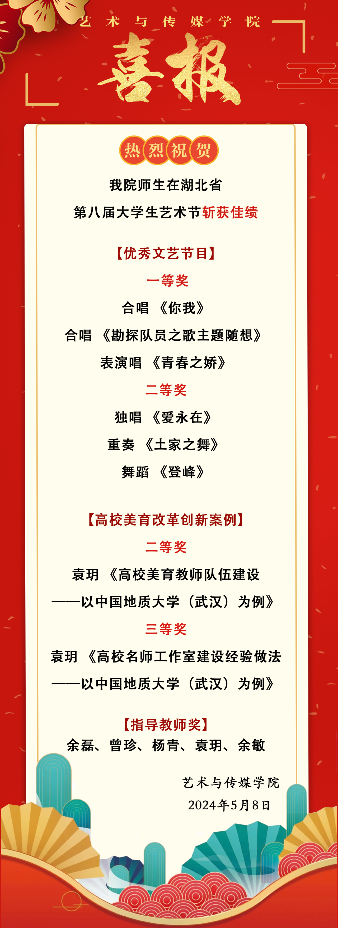 公司多部作品斩获湖北省第八届大学生艺术节多个奖项,不仅是对专业教学成果的肯定,更是学校美育工作在省内的一次成功展示。未来,402永利集团官网入口将继续坚持“以美育人、以文化人”,围绕党和国家发展的时代主题,在习近平文化思想的指引下,将美育实践与学科建设相结合,让音乐之美浸润校园!