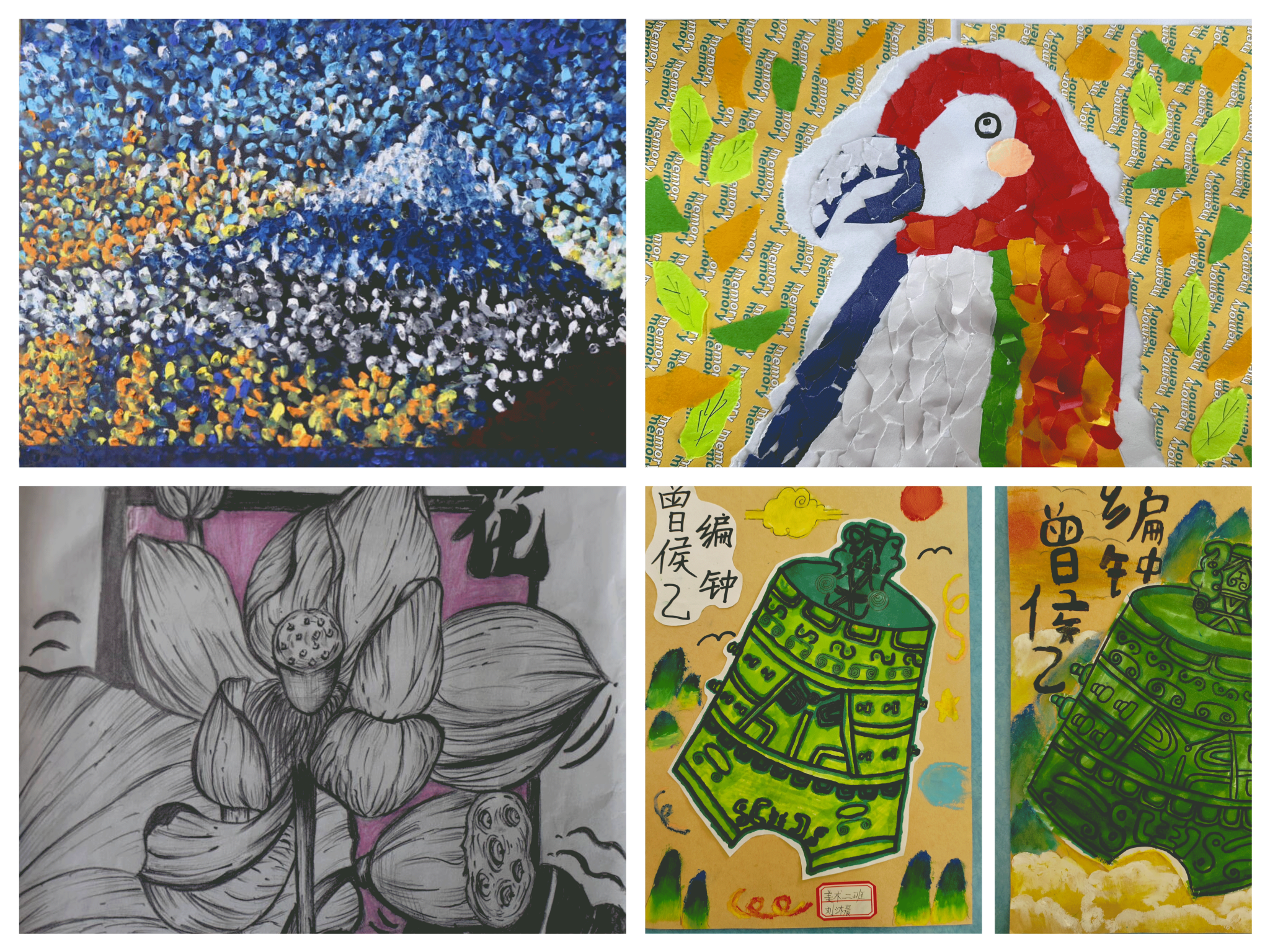 美术课上,小朋友们发挥想象,用画笔创造艺术世界,彩绘作品《千里江山图》、黏土手工《行星》以及拼贴画《鹦鹉》等作品都展示着他们无穷的创造力;音乐课上,小朋友们随着节奏摇摆,清脆的歌声飘荡在教室之中,每一个跳动的音符、每一个旋律都饱含着他们对于艺术无限的热爱;舞蹈课上,小朋友们认真学习,基本功练习到位,舞蹈动作轻柔优美,他们像舞动的精灵,每一个跳动的脚步都展现着他们的美好活力。
