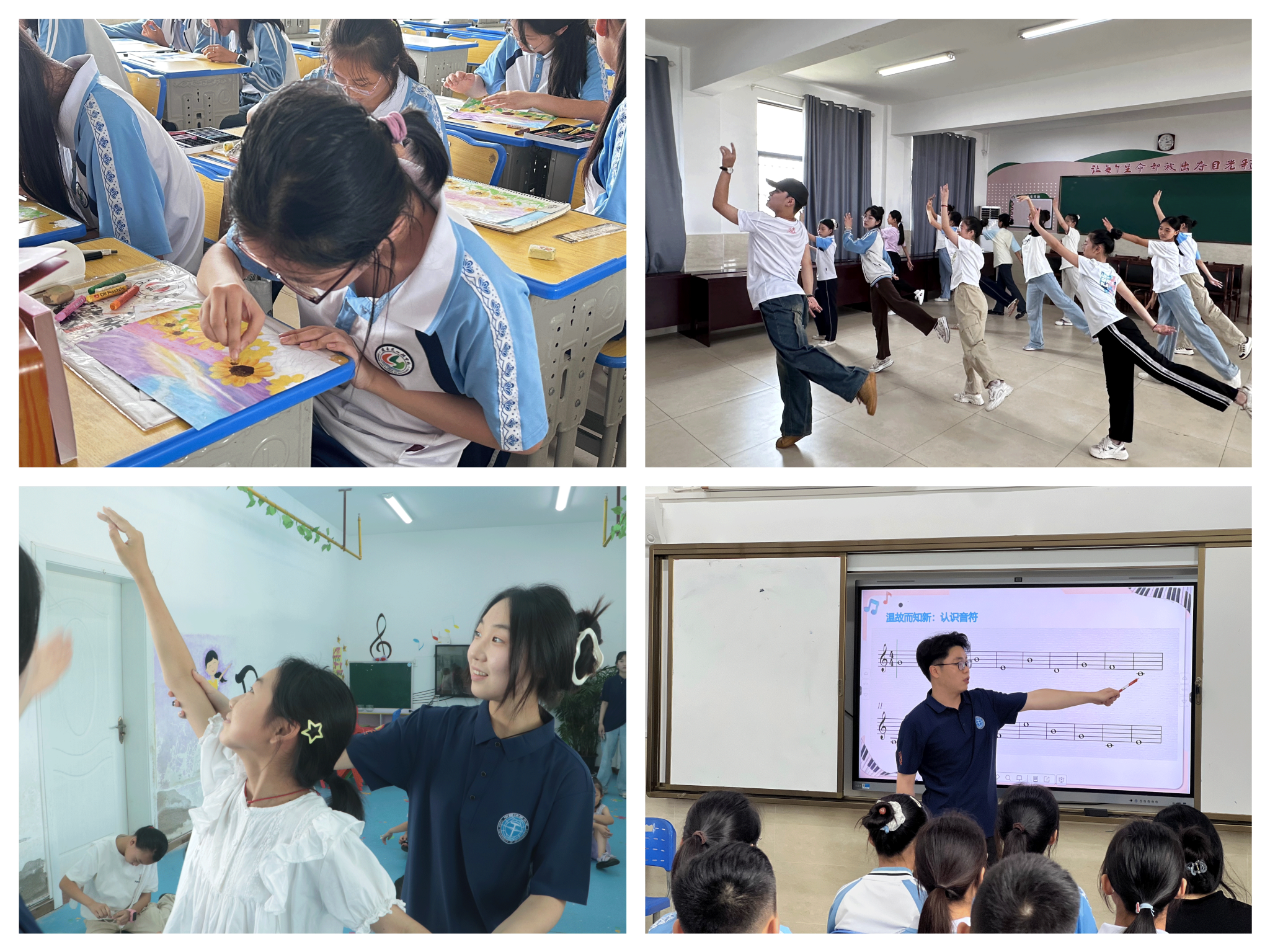 音乐班同学们在赵立堃等4名志愿者老师的带领下,对于基础乐理知识、中国乐器、演唱技法等有了初步的认知;美术班同学们在程静等11名志愿者老师的引导下学习了拼贴作画、蜡笔画、黏土手工、扎染、描摹等内容;舞蹈班同学在张宇晨等3名志愿者老师的教导下,练习了基本功,提升了身体协调性。