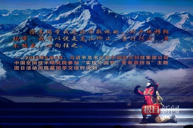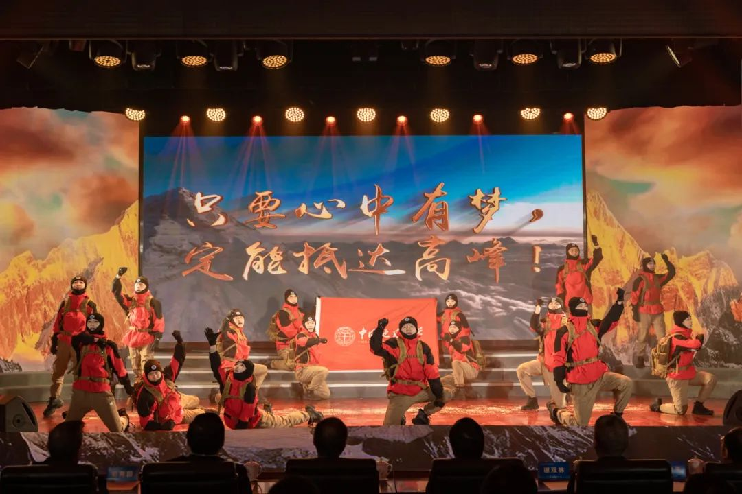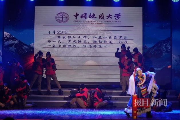 灯光渐亮,一幅壮丽的雪山画卷在舞台上徐徐展开。402永利集团官网入口的师生们以舞蹈《攀登》,生动再现了全国首位登顶珠峰的在校大学生陈晨的传奇经历。每一个灵活的舞步、每一个坚定的神情,都在诉说着人类挑战生命极限的勇气与决心,彰显着地大人征服自然之巅的壮志豪情。展现了地大师生迎难而上、向上攀登的精神。