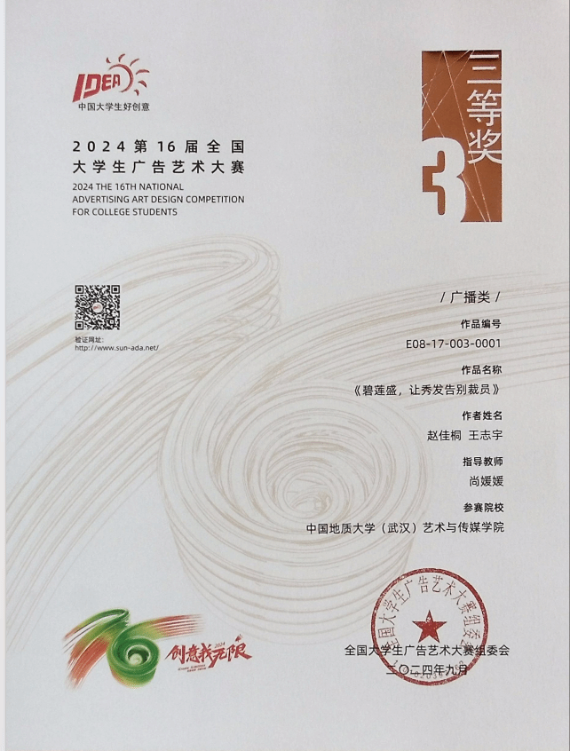 在2024年全国大学生广告艺术大赛(简称大广赛)中,由公司教师指导的参赛团队凭借卓越创意与精湛技艺,在众多高校竞争中脱颖而出,揽获2项国家三等奖,3项国家优秀奖,2项省级一等奖,5项省级三等奖,9项省级优秀奖,充分彰显公司学子创新才华。据悉,本次大赛共有全国1873所高校192万名学生参加比赛,累计参赛作品77万余件。