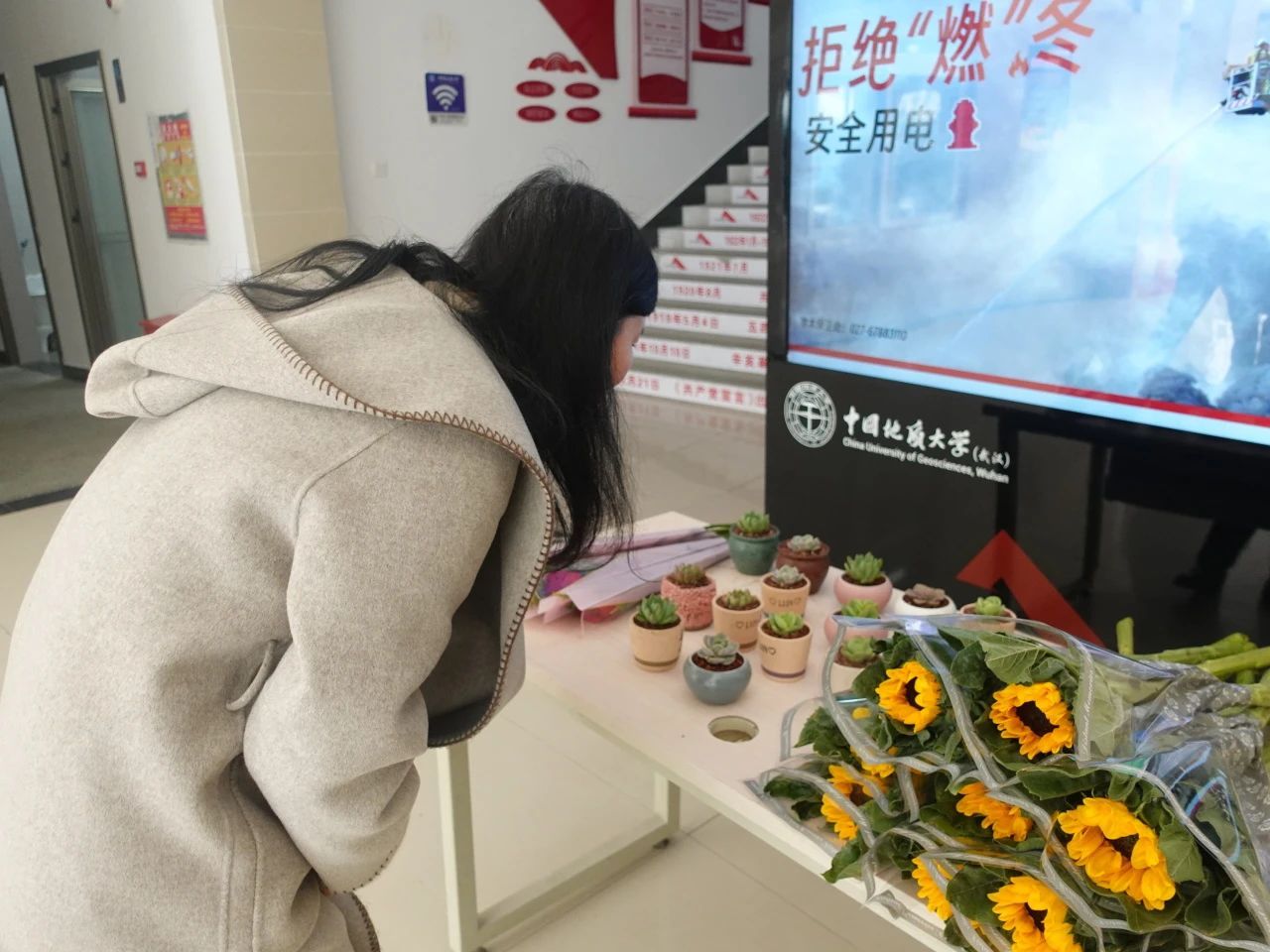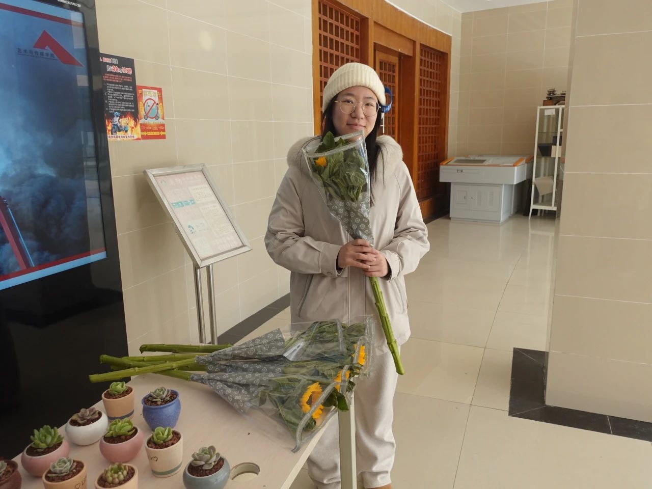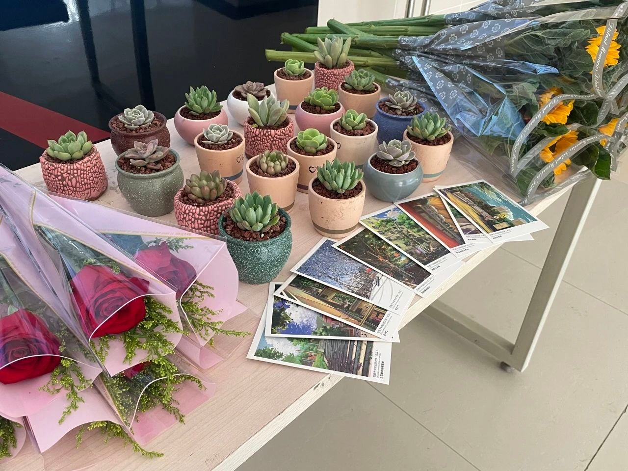 现场准备的花束别具心意,有向日葵、玫瑰与多肉盆栽,洋溢着春天的美好氛围。