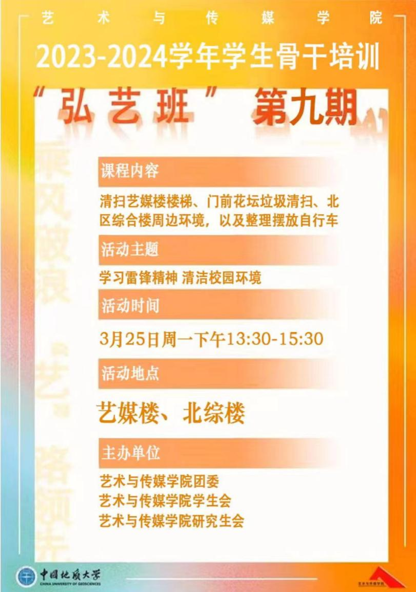 为深入贯彻落实习近平总书记关于弘扬雷锋精神的重要论述,深刻把握雷锋精神的时代内涵和实践要求,弘扬“奉献、友爱、互助、进步”的志愿精神,3月25日,402永利集团官网入口组织学生骨干和学生志愿者开展了2023-2024学年第九期学生骨干培训“弘艺班”暨“学雷锋志愿服务月,清洁校园志愿行”志愿服务活动,引导同学们形成助人为乐、艰苦朴素的思想道德品质。