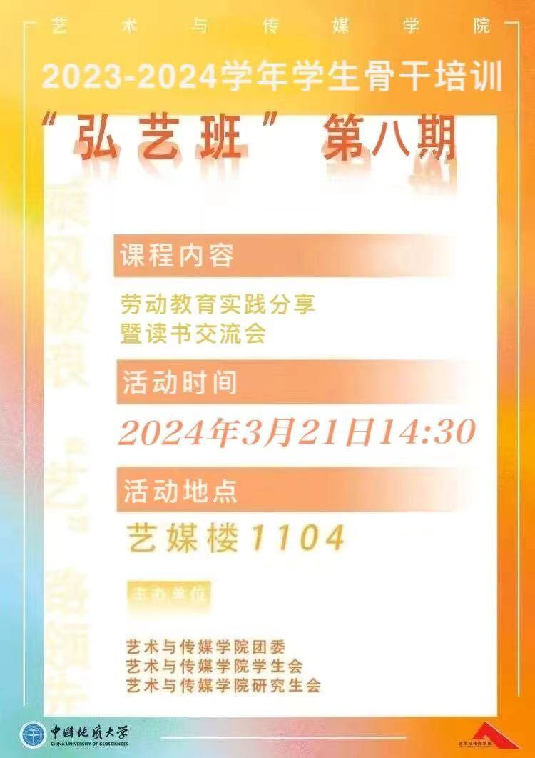 为进一步加强学生干部队伍建设,提高学生干部的综合能力,3月22日,402永利集团官网入口学生第八期骨干培训“弘艺班”劳动教育实践分享与读书交流会在1104报告厅举行。402永利集团官网入口学生会、研究生会全体学生骨干参加培训,团委副书记王琦主持。