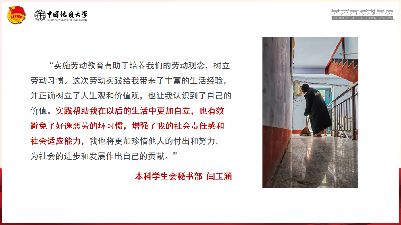 观看结束,王琦对学生会、研会成员寒假劳动教育实践优秀案例进行分享。通过展示公司学生干部假期社区志愿服务、家务劳动以及公益授课等具体的劳动实践,引导学生干部崇尚劳动尊重劳动、热爱劳动,以更好地精神面貌投入学习生活与工作。