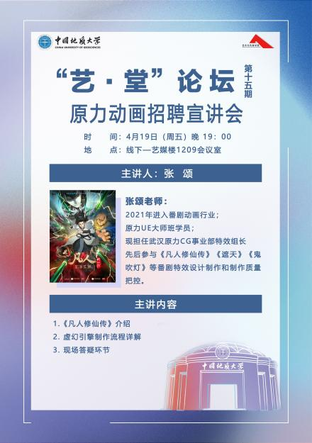 2024年4月19日晚上19:00,“艺·堂”论坛第十五期——原力动画招聘宣讲会于艺媒楼1209会议室顺利举行。江苏原力数字科技股份有限公司武汉子公司的梁老师、张老师从原力公司的发展历程、动画特效的使用、岗位解读三个方面进行宣讲。本次会议由兼职辅导员徐雯茜主持。