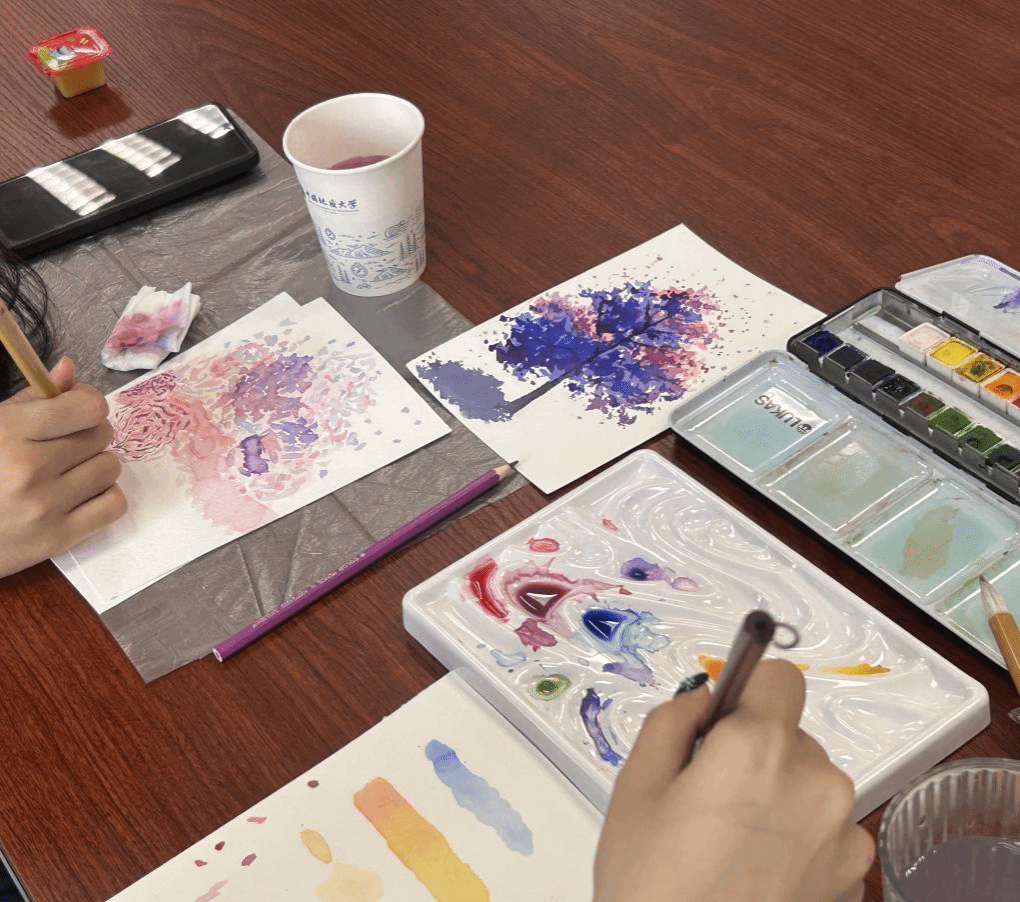 在创作过程中,工作室成员 “艺术疗愈引导者”,穿梭于各小组之间,为大家进行了绘画技巧讲解,包括色彩搭配、晕染方法等。“当水彩在纸上晕开时,感觉心里的烦恼也跟着散开了”,一位参与活动的同学分享道,“平时很少有机会静下心来专注于绘画,这次活动让我重新发现了动手创作的治愈力。”