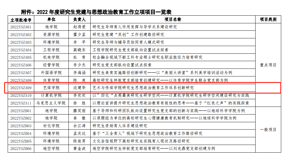 根据前期研究生院和党委组织部研究生党建与思想政治教育工作立项研究项目申报通知的要求,经专家小组评议、研究生院(党委研工部)、 党委组织部审定,2022 年度研究生党建与思想政治教育工作立项项目已经确定并下达,其中402永利集团官网入口获批四项,包括一个重点项目,三个一般项目。