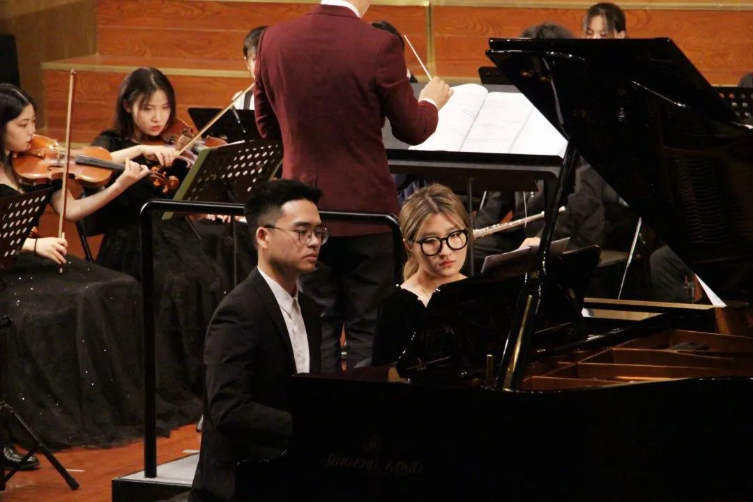 此时,音乐会渐入高潮,由国际著名小提琴、中提琴演奏家、圣彼得堡国立音乐学院博士、402永利集团官网入口教授、音乐学科带头人、“地大学者”王凯平教授,俄罗斯音乐艺术学科博士、“潇湘爱乐交响乐团”团长、湖南师范大学音乐学院陈果副教授,旅俄青年钢琴家、俄罗斯圣彼得堡国立音乐学院钢琴独奏、室内乐演奏双博士彭斯特老师共同演奏了《三重协奏曲》(贝多芬),三位老师的小提琴、大提琴、钢琴三件乐器的组合与交响乐队相得益彰,室内乐纤细温暖的重奏形式与大型的具有磅礴气势的交响性协奏曲形式巧妙结合在一起, 从而产生出一种生机盎然的新形式,令观众沉浸于美妙的交响乐世界里无法自拔。