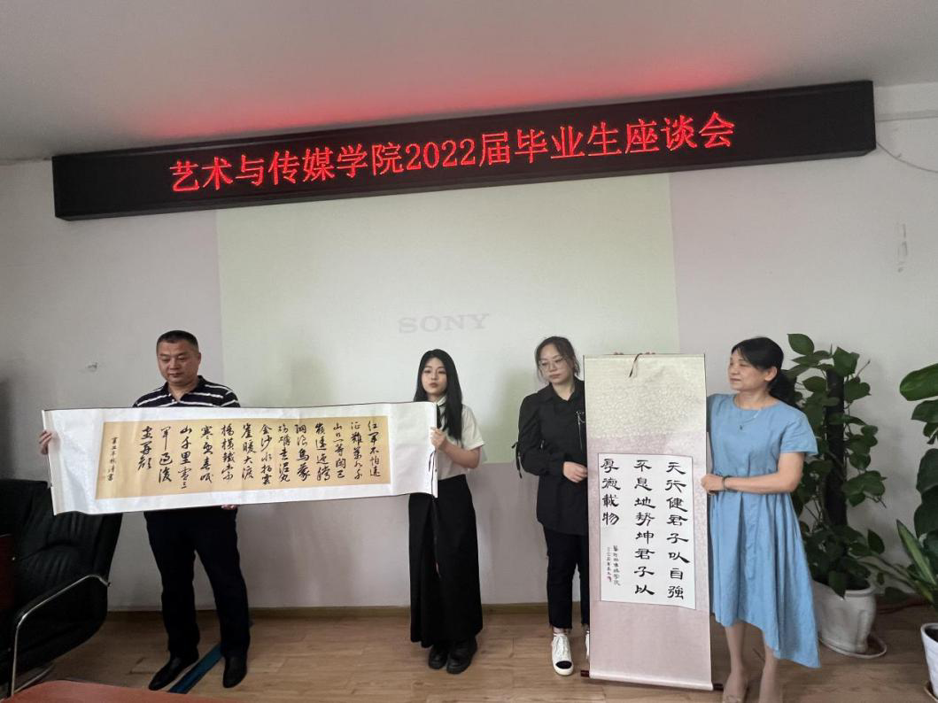 接着,2022届毕业生童瑶和顾彬清两位同学为学院赠送了两幅书法作品作为临别之际献给母校的纪念品,表达了内心的感谢之情,祝愿母校年年桃李,岁岁芬芳。