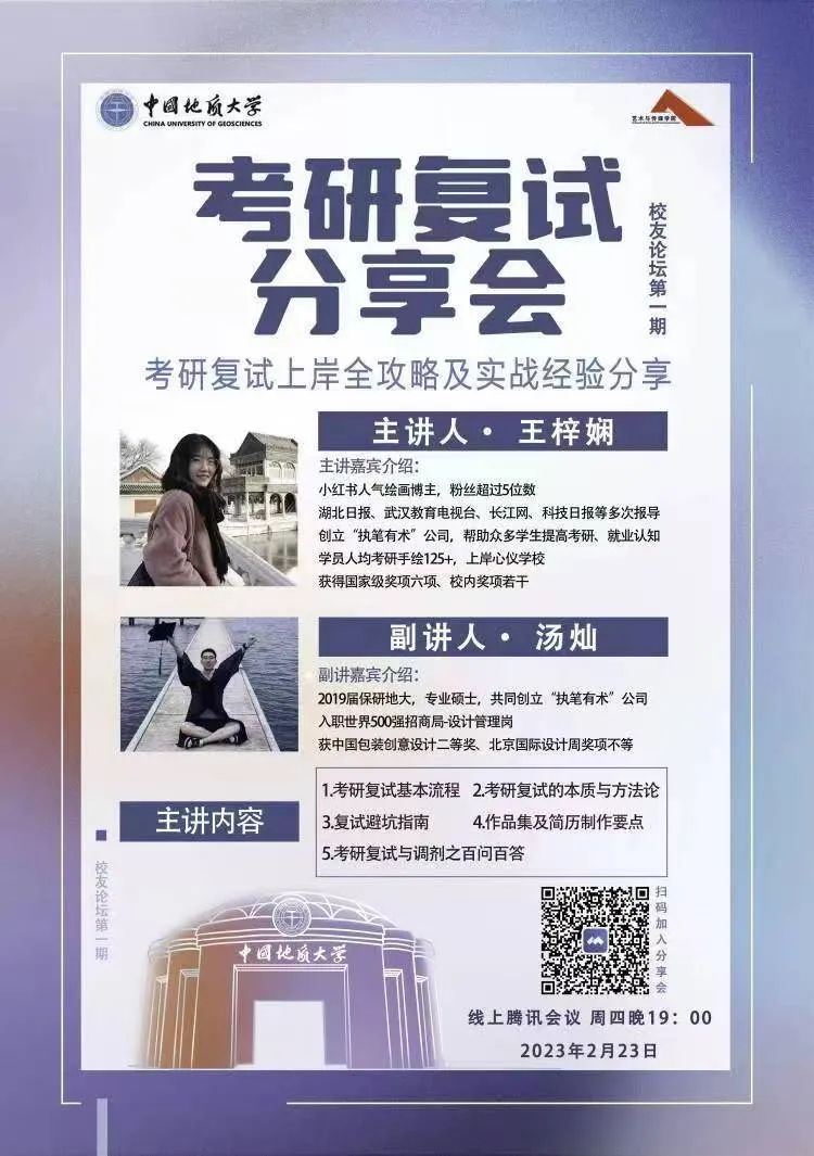 2月23日晚上19:00,402永利集团官网入口在腾讯会议召开了本学期第一期“艺 堂”考研复试专场讲座。“执笔有术”公司的创始人、小红书人气博主王梓娴老师和地大2019级学长汤灿老师做了主题为“2023届考研复试经验解析”的讲座分享。