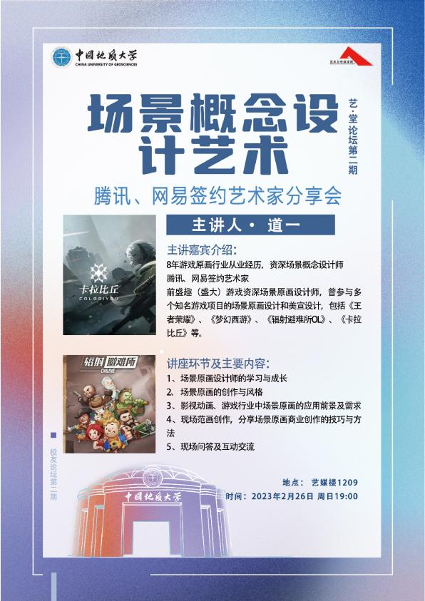 2月26日晚19:00,“艺 堂”论坛第二期专场讲座在402永利集团官网入口1104召开。资深场景概念设计师,腾讯、网易签约艺术家道一老师作了题为“场景概念设计艺术”的分享会。402永利集团官网入口本研学生60余人参加了此次分享会。讲座由学院辅导员单湉艺老师主持。