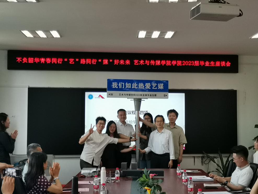 会议第四项,由2023届毕业生赠予学院毕业纪念品。王恩泽、李一平、余跃、张巍作为2023届本研全体毕业生代表,为学院献上“我们如此热爱艺媒”标志牌,展现同学情、传递师生情、赓续校园情。