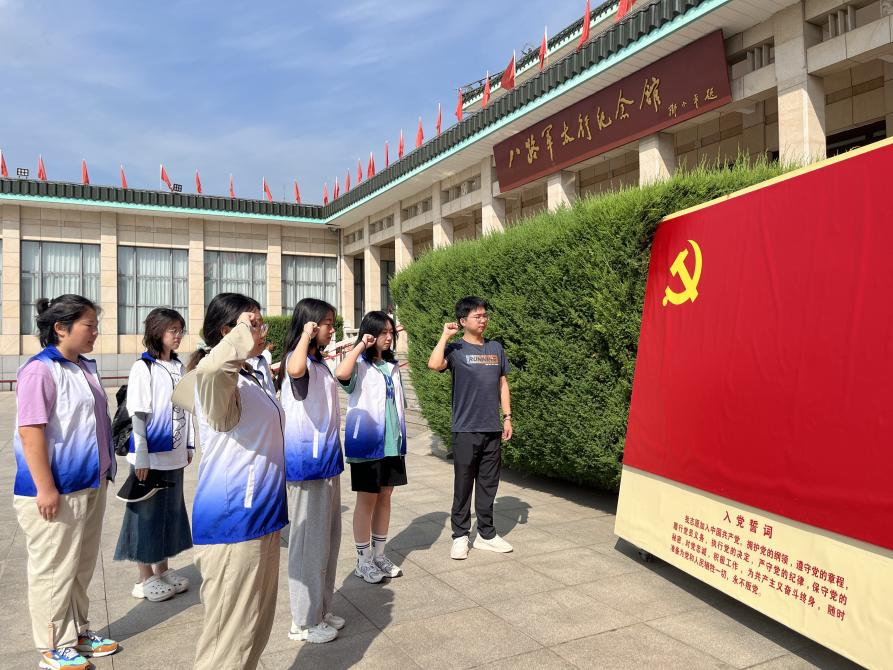 “山山埋忠骨,岭岭皆丰碑”,太行山浸透无数英雄儿女的热血。面对着展馆前方的党旗,党员紧握右拳,庄严宣誓,积极分子行注目礼,重温入党誓词。在太行精神的照耀下,党旗仿佛更加鲜艳。