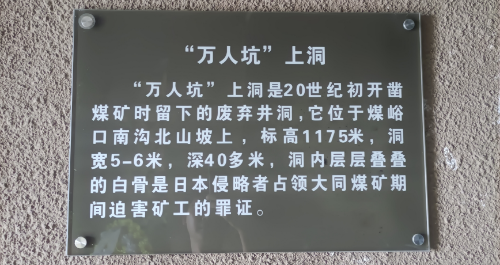 万人坑遗址有上下两洞,洞窟里满是暗沉的尸骸,大大小小的骷髅堆积如山,失去劳动能力的老弱病残在这里丧生,全体成员在坑前久久不语。走出沉重的遗址,万人坑的尸骨历历在目,山上林立的无数座石碑震撼人心,我们更加深刻地认识到中华民族曾经受到过的深重压迫。白骨累累70米,每一寸都洒满了血泪。勿忘国耻,振兴中华,这句话久久在我们心中回荡。