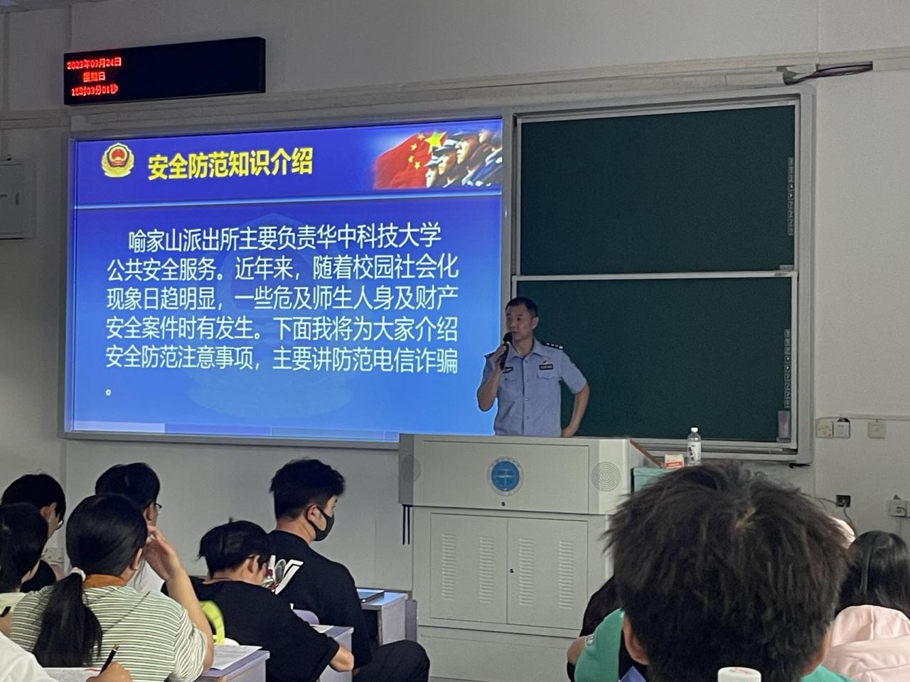 第四场讲座是由武汉市公安局喻家山派出所王东警官主讲的《安全防范知识介绍》。王东警官首先宣讲了大学生防电信网络诈骗的安全知识,注意人身、财产安全以及无意识中的违法行为等问题,为刚步入大学的新生敲响了警钟。随后,他通过公司以往诈骗真实案例警示新生要提高自身的防骗意识,认清网络诈骗形式的多样性。