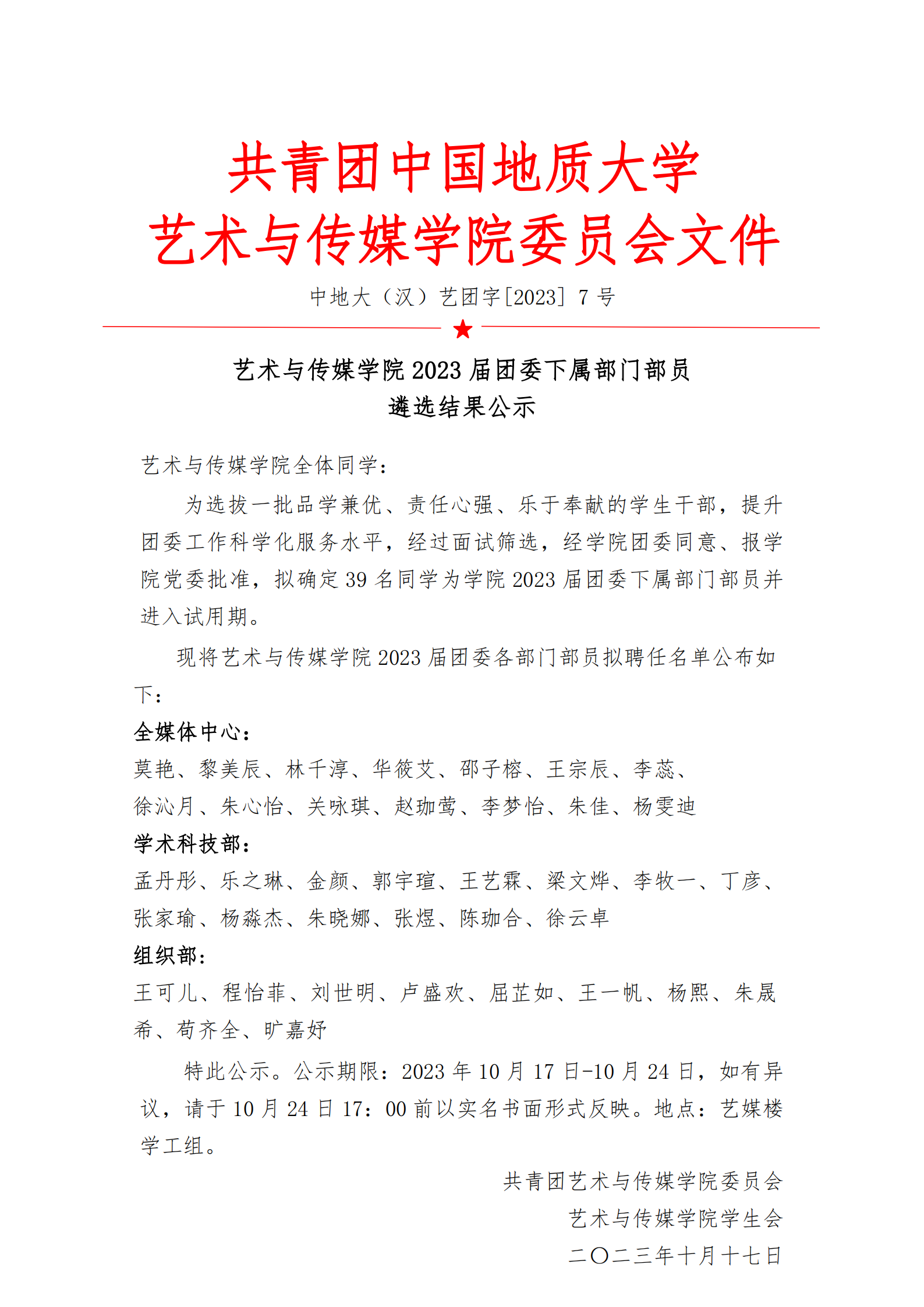 通知 | 402永利集团官网入口2023届团委下属部门部员遴选结果公示