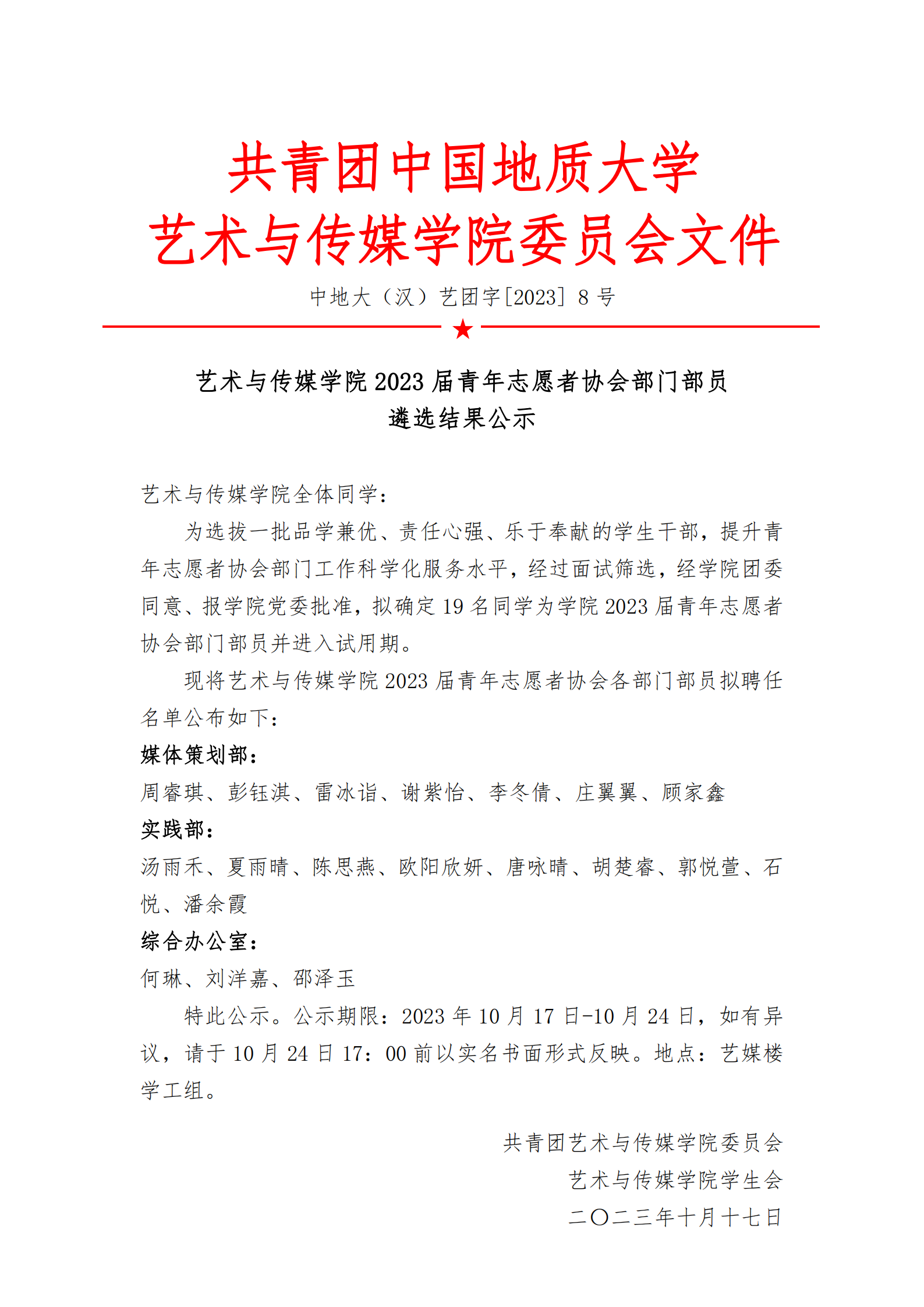 通知 | 402永利集团官网入口2023届青年志愿者协会部门部员遴选结果公示