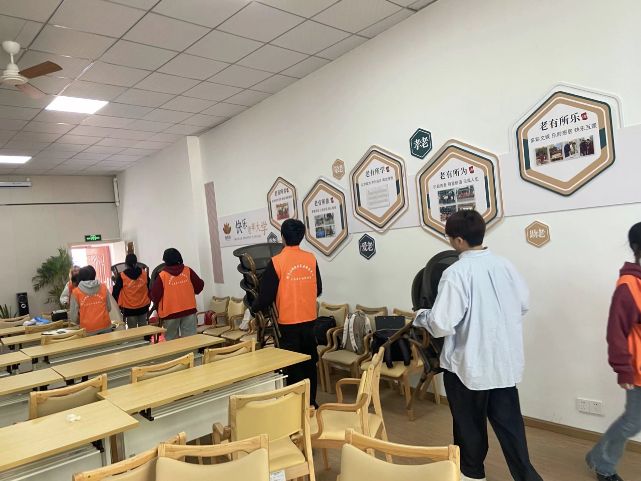 公司志愿者们于7:30准时出发,前往洪山区狮子山街道养老服务中心。抵达敬老院后,志愿者迅速开始布置活动场地,搀扶老人们入座,为即将展开的艺术活动做精心的准备。