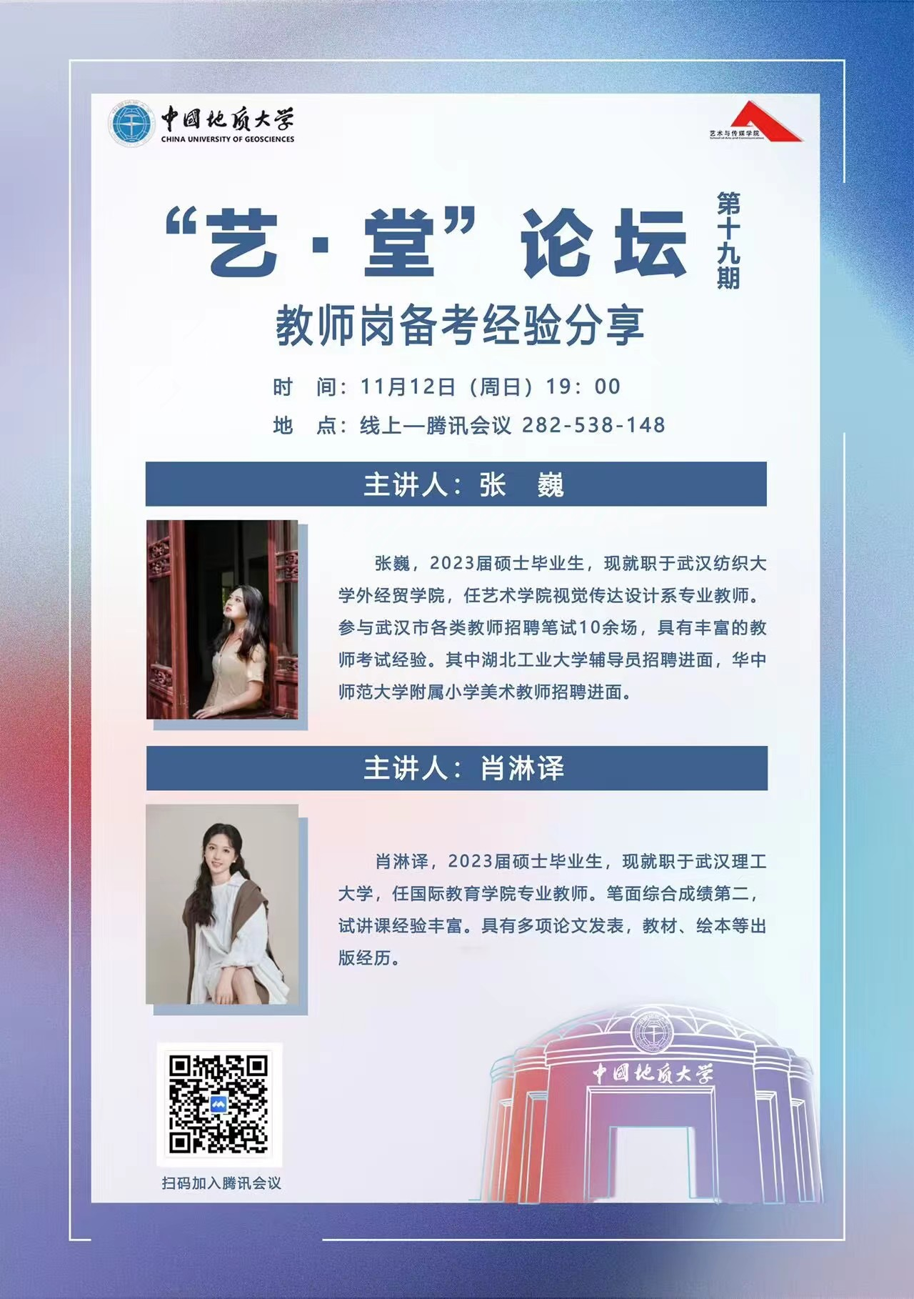 2023年11月12日晚上19:00,“艺·堂”论坛第十九期教师岗备考经验分享会于线上腾讯会议平台顺利举行。学院邀请了2023届研究生毕业生、现就职于武汉理工大学国际教育学院的肖淋译和就职于武汉纺织大学外经贸学院的张巍进行备考分享。本次讲座由兼职辅导员于梦涵主持。
