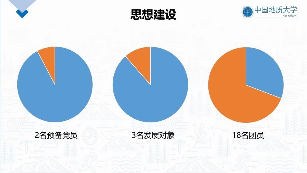 我们不但一直以团员的标准严格要求自己,积极学习并贯彻党的路线、方针及政策,还积极向党组织靠拢。到目前为止,班级团员18人,经过层层考核与答辩,现支部共推优8人,其中入党积极分子有3人,发展对象有3人,预备党员有2人。