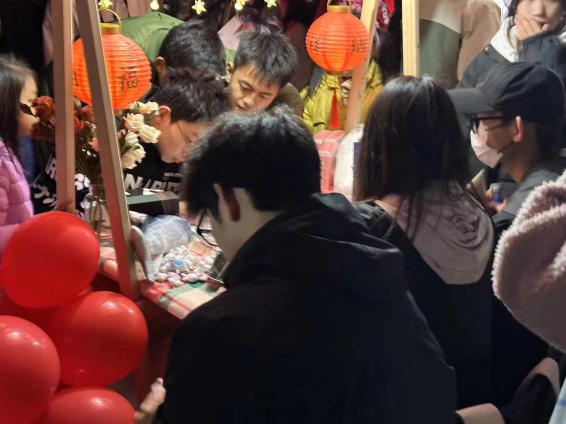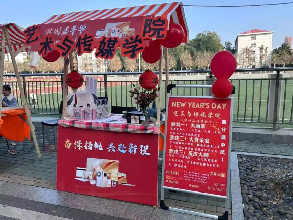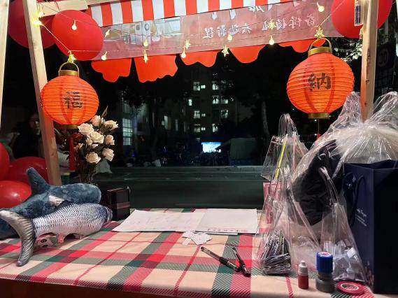 艺媒学院的摊位更是门庭若市。进入游园嘉年华的首端“402永利集团官网入口”几个被红气球簇拥的艺术字体引人注目,两盏红灯笼挂在陈列着鲜花与奖品的桌板上,吸引着同学们的到来。一旁的游戏规则边,驻足着许多跃跃欲试的同学,期待着活动开始。