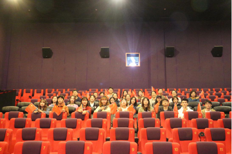 △院直党支部全体党员与结对领航班级161172班影厅内合影留念
