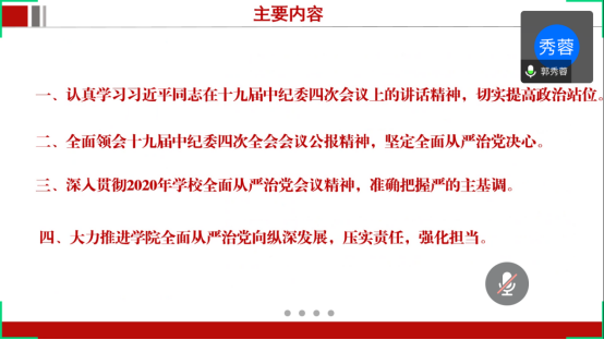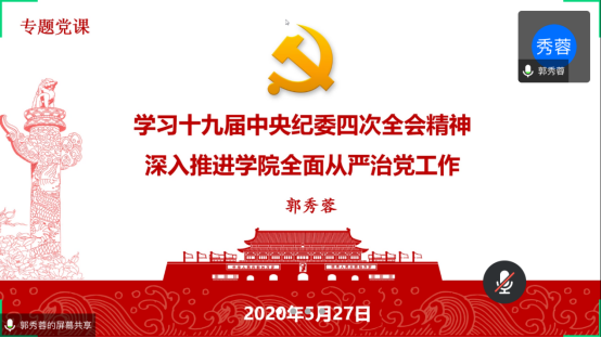 (通讯员 李伟娜)5月27日下午3:00,学院党委通过腾讯会议召开了公司2020年全面从严治党大会暨党委理论学习中心组2020年第4次集中学习。学院领导班子、党委委员、全体教职工党支部书记及院直全体党员参加了本次大会,会议由党委书记郭秀蓉主持。
