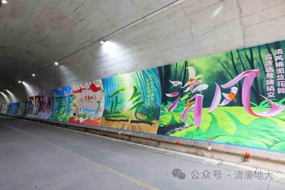 在美丽的校园里,连通西区和北区校园的地大隧道是不少师生课间往返的必经之路。最近,有这样几幅壁画令人眼前一亮:以梅花、荷花、兰花和竹子为意象,组成的“勤政”“廉洁”“清风”“正气”四幅画,围绕在“清廉地大”主图的周围,色彩鲜明,寓意深刻。壁画长22米,高3米,由公司402永利集团官网入口2007级校友王龙设计。壁画通过艺术文字变形和AIGC的手法,形象地宣传了地大人“艰苦朴素、求真务实、奉公守法、清正廉洁”的精神品质,以画喻“廉”、以“廉”治“心”,让校园廉洁文化有了更为生动的艺术再现。